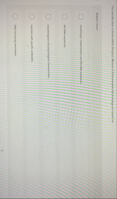 The identification schema within Bergey's Manual of Determinative Bacteriology are based on Multiple Choice morphologic characteristics and 165 RNA sequences. 16S RNA sequences. morphological and physiological characteristics. reactions with specific antibodies. DNA microarray information.