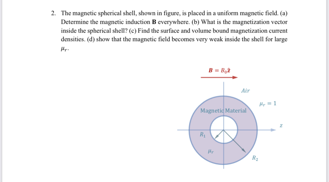 The magnetic spherical shell, shown in figure, is placed in a uniform magnetic field. (a) Determine the magnetic induction B everywhere. (b) What is the magnetization vector inside the spherical shell? (c) Find the surface and volume bound magnetization current densities. (d) show that the magnetic field becomes very weak inside the shell for large