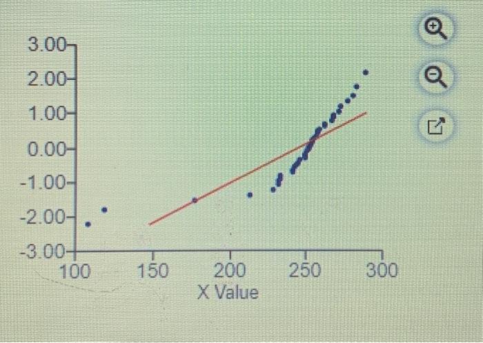 The normal quantile plot shown to the right represents duration times (in seconds) of eruptions of a certain geyser from the accompanying data set. Examine the normal quantile plot and determine whether it depicts sample data from a population with a normal distribution. Click the icon to view the data set. A. The distribution is normal. The points show a systematic pattern that is not a straight-line pattern. B. The distribution is normal. The points are reasonably close to a straight line and do not show a systematic pattern that is not a straight-line pattern. C. The distribution is not normal. The points do not show any systematic pattern. D. The distribution is not normal. The points are not reasonably close to a straight line.
