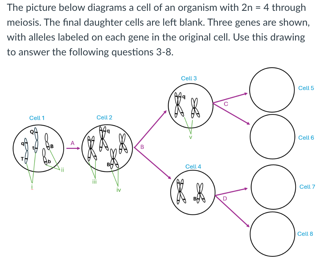 2n=4through meiosis. The final daughter cells are left blank. Three genes are shown, with alleles labeled on each gene in the original cell. Use this drawing to answer the following questions 3-8. 3. What is the genotype of this organsim? a. ttqqbb b.TTQQBB c. TtQqBb d. TQB or tqb e. TqB or tQb 4. Correctly match each process with the correct arrows (labeled in purple) on the diagram above. A -> Meiosis 2, Meiosis 1, Translation, Transcription, Replication, or Mutation B -> Meiosis 2, Meiosis 1, Translation, Transcription, Replication, or Mutation C -> Meiosis 2, Meiosis 1, Translation, Transcription, Replication, or Muatation D -> Meiosis 2, Meiosis 1, Translation, Transcription, Replication, or Mutation