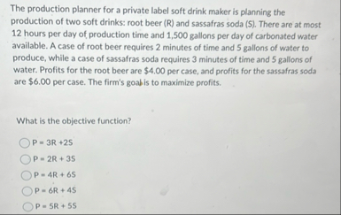 The production planner for a private label soft drink maker is planning the production of two soft drinks: root beer (R) and sassafras soda (S). There are at most 12 hours per day of, production time and 1,500 gallons per day of carbonated water available. A case of root beer requires 2 minutes of time and 5 gallons of water to produce, while a case of sassafras soda requires 3 minutes of time and 5 gallons of water. Profits for the root beer are