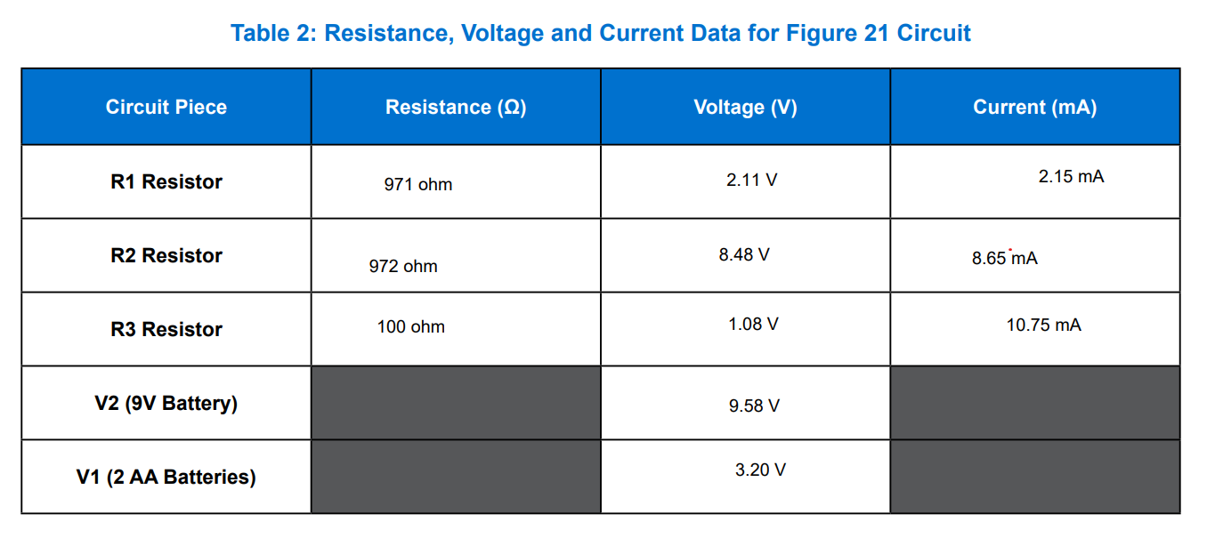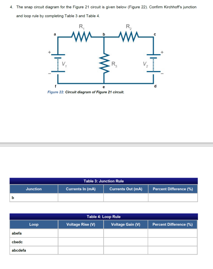 The snap circuit diagram for the Figure 21 circuit is given below (Figure 22). Confirm Kirchhoff's junction and loop rule by completing Table 3 and Table 4. Please, Im stuck with this exercise. Need help. Data below (table 2) to answer the empty table. Thanks so much.