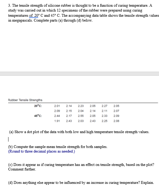 45\deg C. The accompanying data table shows the tensile strength values in megapascals. Complete parts (a) through (d) below. Rubber Tensile Strengths (a) Show a dot plot of the data with both low and high temperature tensile strength values. (b) Compute the sample mean tensile strength for both samples. (Round to three decimal places as needed.) (c) Does it appear as if curing temperature has an effect on tensile strength, based on the plot? Comment further. (d) Does anything else appear to be influenced by an increase in curing temperature? Explain.