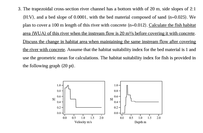 The trapezoidal cross-section river channel has a bottom width of 20 m, side slopes of 2:1 (H:V), and a bed slope of 0.0001, with the bed material composed of sand (n=0.025). We plan to cover a 100 m length of this river with concrete (n=0.012). Calculate the fish habitat area (WUA) of this river when the instream flow is 20 m³/s before covering it with concrete. Discuss the change in habitat area when maintaining the same instream flow after covering the river with concrete. Assume that the habitat suitability index for the bed material is 1 and use the geometric mean for calculations. The habitat suitability index for fish is provided in the following graph (20 pt).
