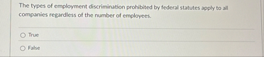 The types of employment discrimination prohibited by federal statutes apply to all companies regardless of the number of employees.