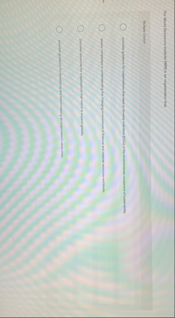 The World Resources institute (WRI) is an organization that Multiple Choice provides guidance for organizations that want to develop indicanors [ESGA] of the enwonmental componert of tratainabity. assists companies in understanding the changing enworment of financial and material resources worldwide. provides resources for organiaations that intend to expand ofobaly. provides guidance for developing and benchmarking an organiation's value chain.