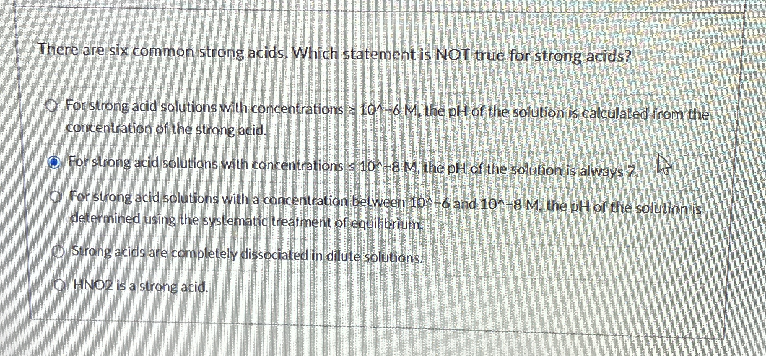 There are six common strong acids. Which statement is NOT true for strong acids? For strong acid solutions with concentrations