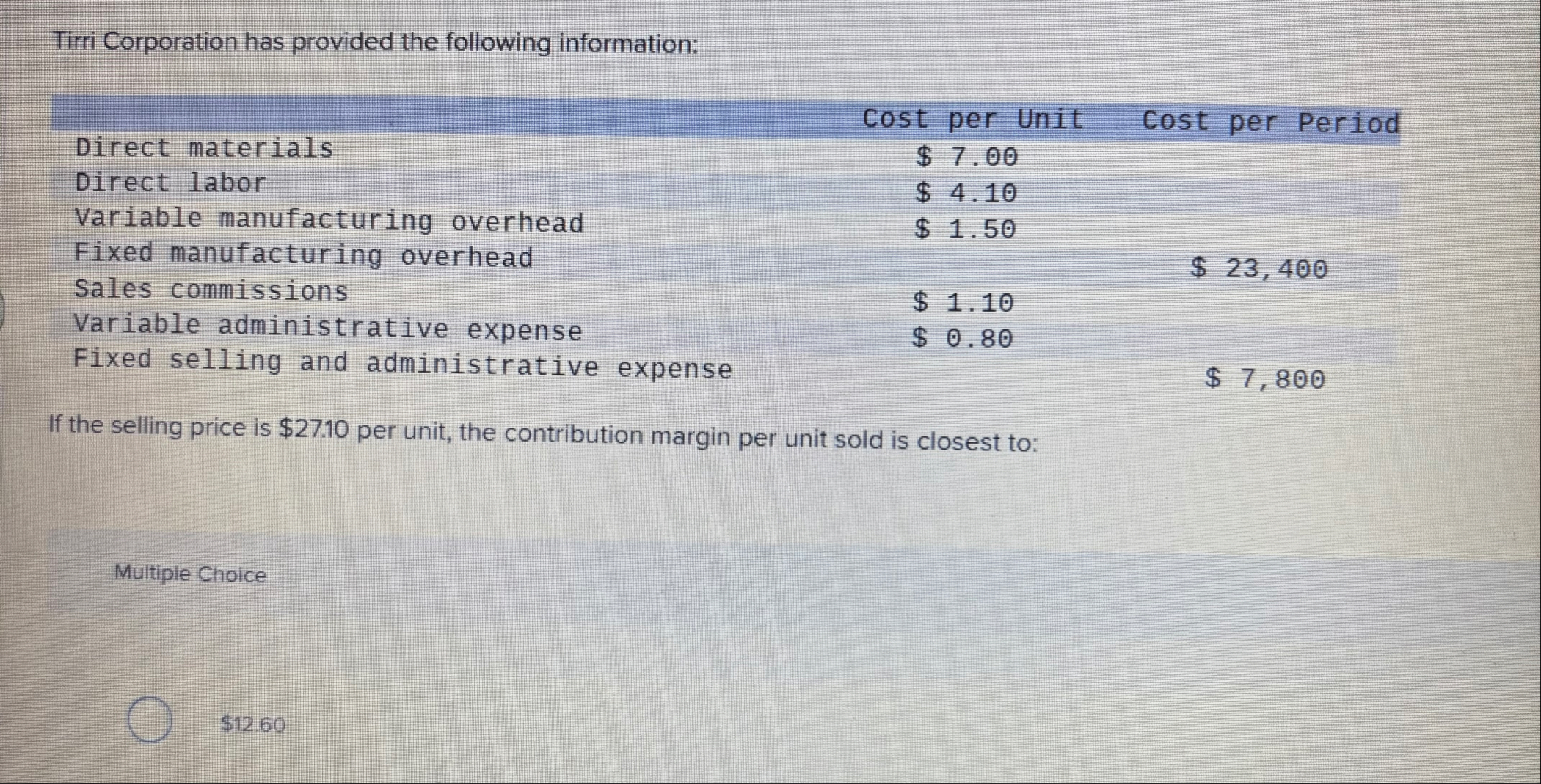Tirri Corporation has provided the following information: \table[[,Cost per Unit,Cost per Period],[Direct materials,$ 7.00,],[Direct labor,$ 4.10,],[Variable manufacturing overhead,$ 1.50,],[Fixed manufacturing overhead,,$ 23,400],[Sales commissions,$ 1.10,],[Variable administrative expense,$ 0.80,],[Fixed selling and administrative expense,,$ 7,800]] If the selling price is