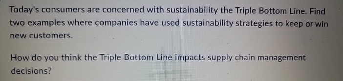 Today's consumers are concerned with sustainability the Triple Bottom Line. Find two examples where companies have used sustainability strategies to keep or win new customers. How do you think the Triple Bottom Line impacts supply chain management decisions?