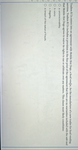 Trailers R Us enters into an agreement with Mobile Hot Dogs, a food ven?or, for the manufacture of a new trailer for food vending services. Trailers R Us includes a provision in the fine print of the agreement that there are no warranties included with the sale and that Mobile Hot Dogs agrees to waive its rights to sue or arbitrate over any matters. This clause most likely constitutes: a. unconscionability. b. usury. c. illegality. d. breach of the statue of frauds.