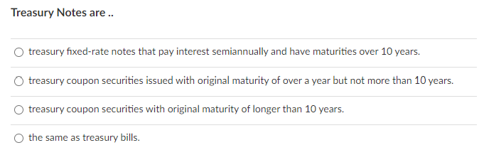 Treasury Notes are .. treasury fixed-rate notes that pay interest semiannually and have maturities over 10 years. treasury coupon securities issued with original maturity of over a year but not more than 10 years. treasury coupon securities with original maturity of longer than 10 years. the same as treasury bills.
