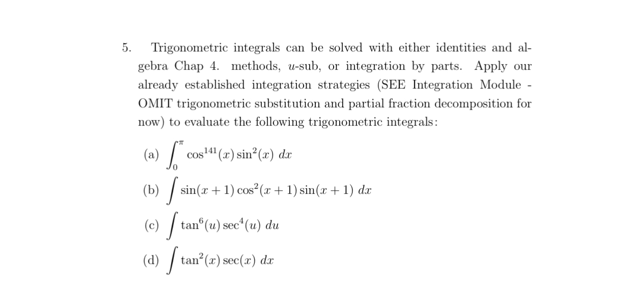 u-sub, or integration by parts. Apply our already established integration strategies (SEE Integration Module - OMIT trigonometric substitution and partial fraction decomposition for now) to evaluate the following trigonometric integrals: (a)