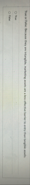 True or False: Because they are intangible, marketing assets are a less effective barrier to entry than tangible assets. True Patse