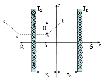 Two infinite sheets of current flow parallel to the y-z plane as shown. The sheets are equally spaced from the origin by xo = 5.6 cm. Each sheet consists of an infinite array of wires with a density n = 19 wires/cm. Each wire in the left sheet carries a current I1 = 2.5 A in the negative z-direction. Each wire in the right sheet carries a current I2 = 3.2 A in the positive z-direction.