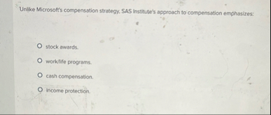 Unike Microsoft's compensation strategy. SAS Institute's approach to compensation emphasizes: stock awards. worklide programs. eash compensation. Income protection.