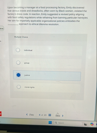 Upon becoming a manager at a food processing factory. Emily discovered that various braids and dreadlocks, often worn by Black women, violated the factory's dress code. In reaction, Emily suggested a revised policy aligning with food safety regulations while refraining from banning particular hairstyles. Her aim for impartially applicable organizational policies embodies the approach to ethical dilemma resolution. 8.44 Multiple Choice individual group justice moral-rights Prey 4 of 20 Next