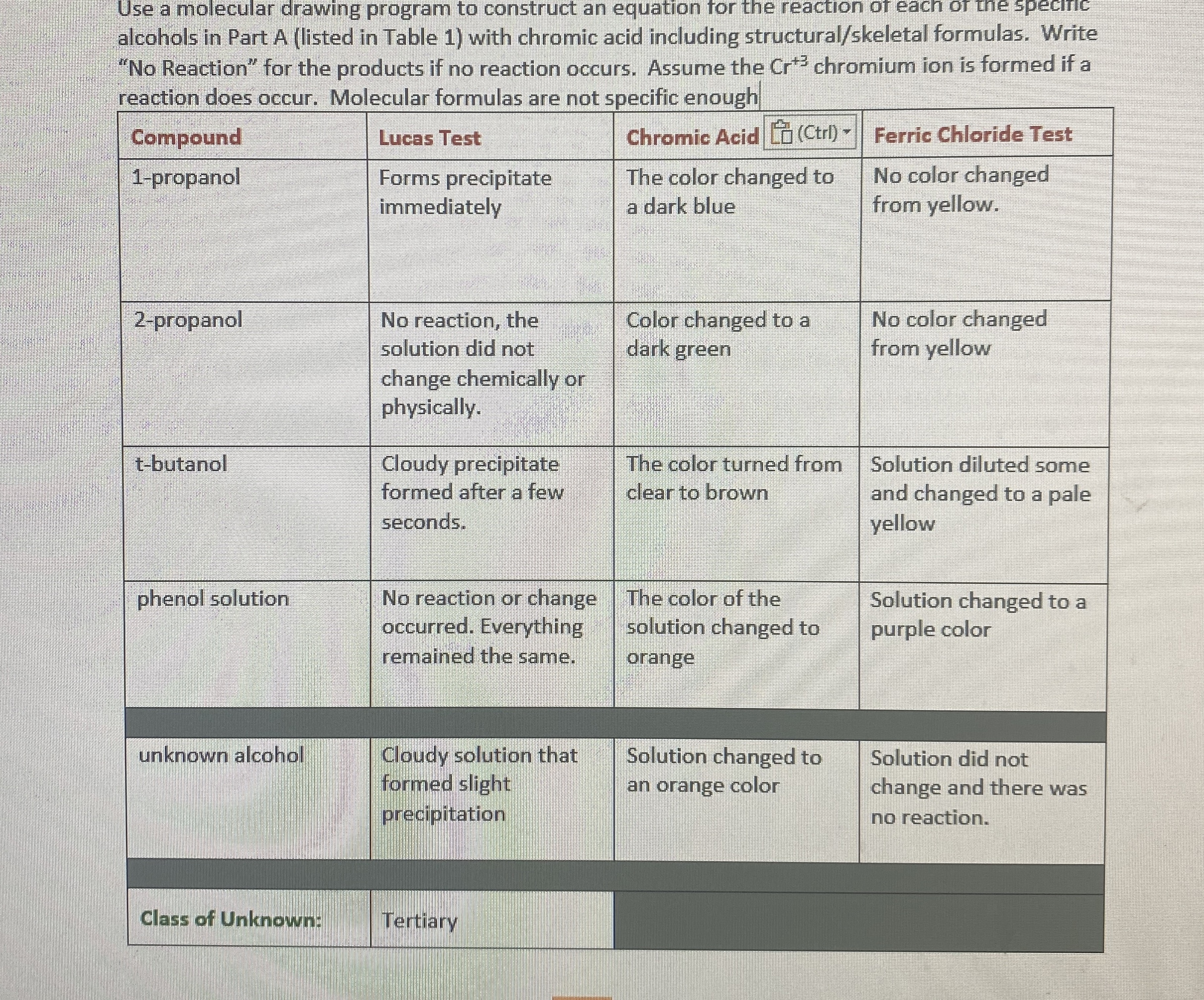 [[ Laltr) ],Ferric Chloride Test],[1-propanol,\table[[Forms precipitate],[immediately]],\table[[The color changed to],[a dark blue]],\table[[No color changed],[from yellow.]]],[2-propanol,\table[[No reaction, the],[solution did not],[change chemically or],[physically.]],\table[[Color changed to a],[dark green]],\table[[No color changed],[from yellow]]],[t-butanol,\table[[Cloudy precipitate],[formed after a few],[seconds.]],\table[[The color turned from],[clear to brown]],\table[[Solution diluted some],[and changed to a pale],[yellow]]],[phenol solution,\table[[No reaction or change],[occurred. Everything],[remained the same.]],\table[[The color of the],[solution changed to],[orange]],\table[[Solution changed to a],[purple color]]],[Class of Unknown:,\table[[Cloudy solution that]],\table[[Solution changed to],[an orange color]],\table[[Solution did not],[change and there was],[no reaction.]]]]
