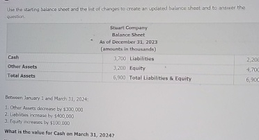 Use than stareng balance sheet ard the list of dtanges to create an updated balance sheet and to answer then questisn. Between lanuary 1 and March 31,2024 Other Asves decrease by