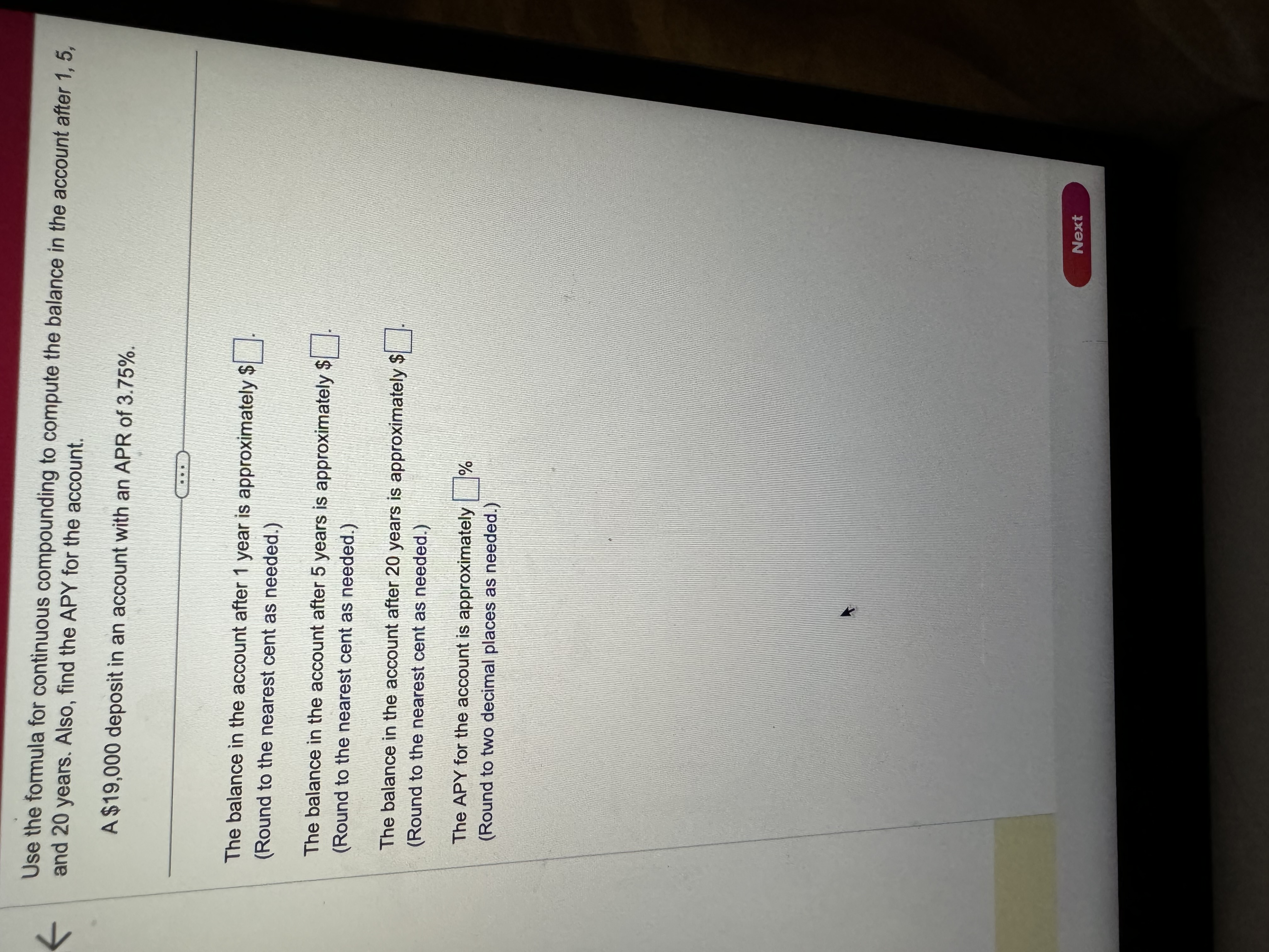 Use the formula for continuous compounding to compute the balance in the account after 1,5 , and 20 years. Also, find the APY for the account. A \( \$ 19,000 \) deposit in an account with an APR of \( 3.75 \% \). The balance in the account after 1 year is approximately \$ (Round to the nearest cent as needed.) The balance in the account after 5 years is approximately \( \$ \) (Round to the nearest cent as needed.) The balance in the account after 20 years is approximately \( \$ \) (Round to the nearest cent as needed.) The APY for the account is approximately \( \% \) (Round to two decimal places as needed.)