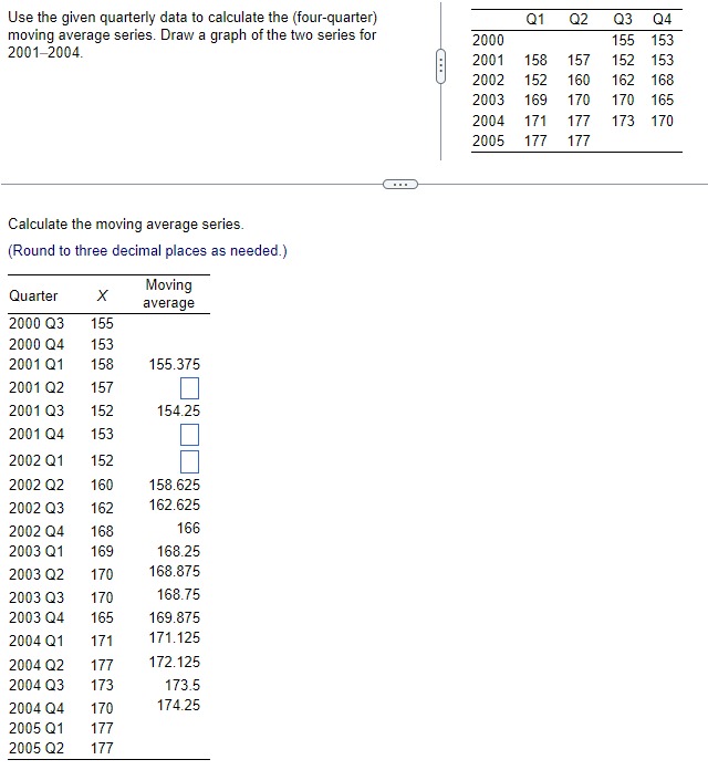 Use the given quarterly data to calculate the (four-quarter) moving average series. Draw a graph of the two series for