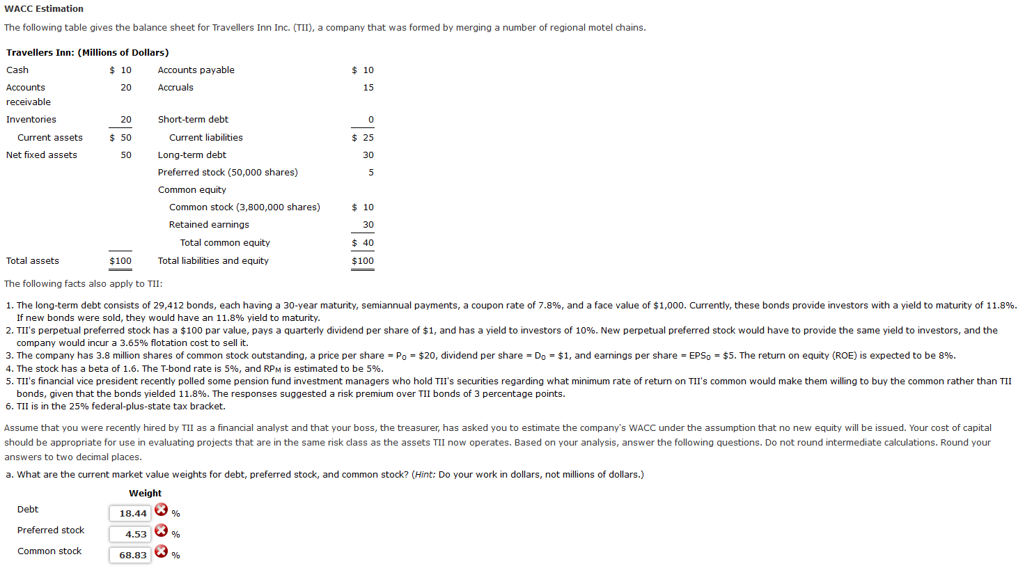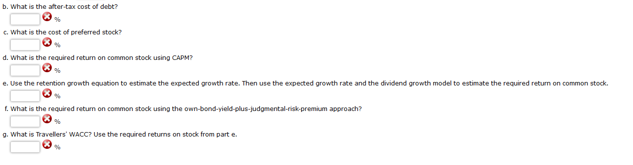WACC Estimation The following table gives the balance sheet for Travellers Inn Inc. (TII), a company that was formed by merging a number of regional motel chains. Travellers Inn: (Millions of Dollars)Accounts receivable The following facts also apply to TII: If new bonds were sold, they would have an \( 11.8 \% \) yield to maturity. company would incur a \( 3.65 \% \) flotation cost to sell it. 4. The stock has a beta of 1.6 . The T-bond rate is \( 5 \% \), and RP M is estimated to be \( 5 \% \). bonds, given that the bonds yielded \( 11.8 \% \). The responses suggested a risk premium over TII bonds of 3 percentage points. 6. TII is in the 25\% federal-plus-state tax bracket. answers to two decimal places. a. What are the current market value weights for debt, preferred stock, and common stock? (Hint: Do your work in dollars, not millions of dollars.) b. What is the after-tax cost of debt? \% c. What is the cost of preferred stock? \% d. What is the required return on common stock using CAPM? \% \% f. What is the required return on common stock using the own-bond-yield-plus-judgmental-risk-premium approach? \% g. What is Travellers' WACC? Use the required returns on stock from part e. \%