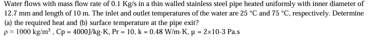 Water flows with mass flow rate of 0.1K(g)/(s) in a thin walled stainless steel pipe heated uniformly with inner diameter of