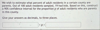 We wish to estimate what percent of adult residents in a certain county are parents. Out of 100 adult residents sampled, 19 had kids. Based on this, construct a