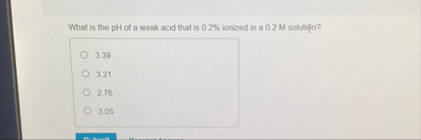 (Solved): What is the pH of a weak acid that is 0.2% ionized in a 0.2 M solutin? 3.39 321 2.76 305 ...