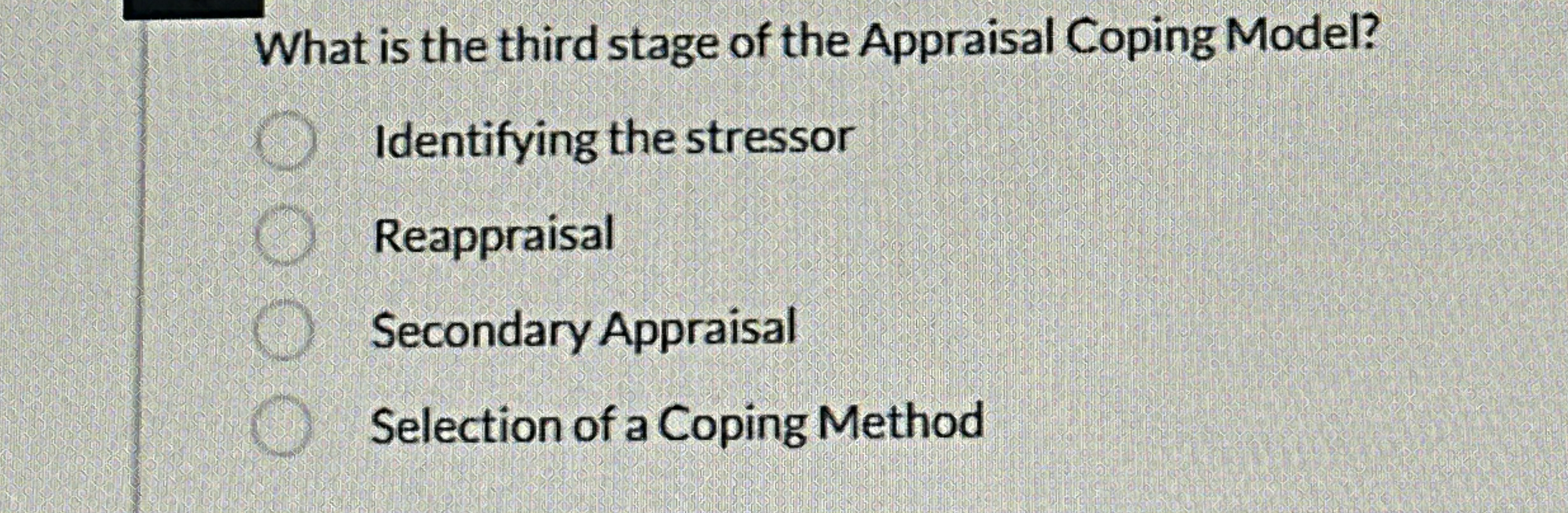What is the third stage of the Appraisal Coping Model? Identifying the stressor Reappraisal Secondary Appraisal Selection of a Coping Method