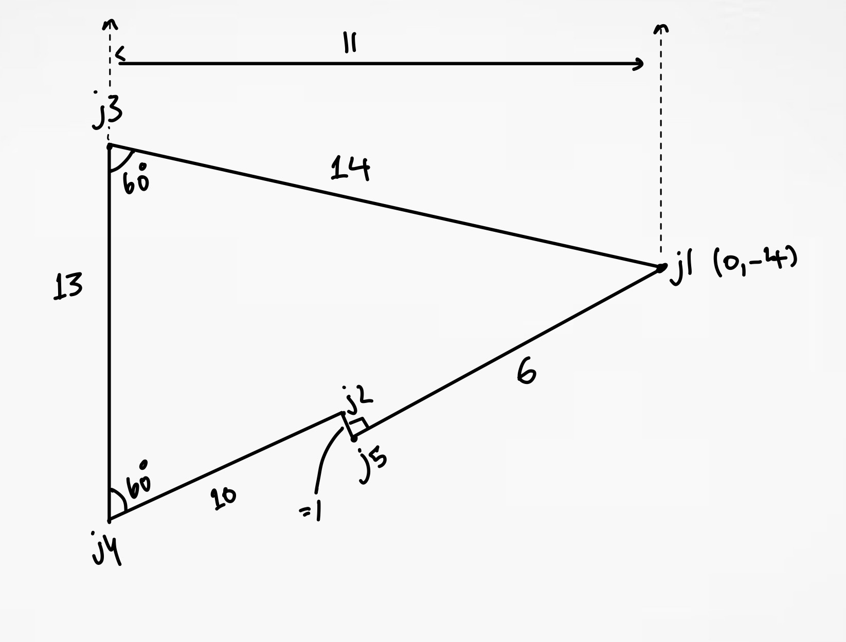What is the vector loop equation around this 5 bar linkage?, all joints are rotary and the coordinates of joint (J1) is shown, please provide the closure equations in a way they can be broken down into two scalar components (x,y), use sin and cos for angles, please. ( This is part of the strider linkage mechanism, it is the bottom left leg)