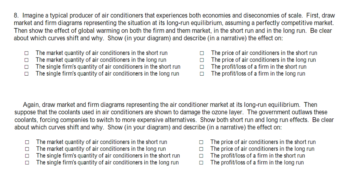 What is this? The bulleted lists are not "answers" they are concepts that need to be shown on the market and firm graphs the question is asking us to draw. Can you please show me how to draw the market and firm diagrams for these two scenarios??