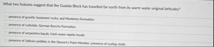 What two features suggest that the Guabla Block hars travelled far north from its warm water original latitudes? prevence of granitic baiement rocks and Monterey Formation presence of rudistidx: German Ranche Formation presence of ierpentine basalt, fiesh water reptile forshls prevence of Salivain pebbles in the Stewart's Poiet Menter, presesce af scallop whels