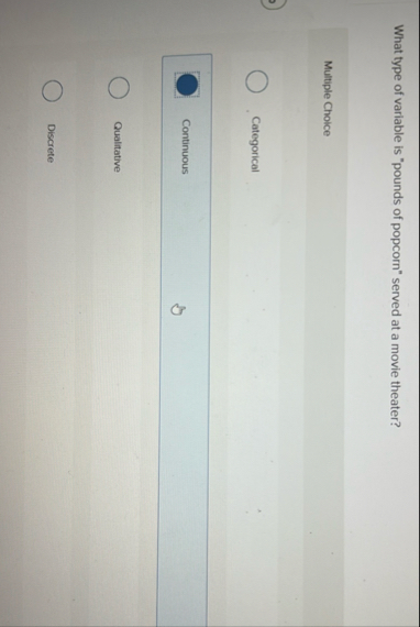 What type of variable is "pounds of popcorn" served at a movie theater? Multiple Choice