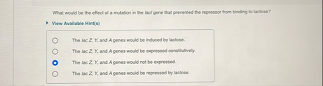 What would be the eflect of a mutation in the lacl gene that preverted the repressor hom binding to lactose? View Available Hint(s) The lac