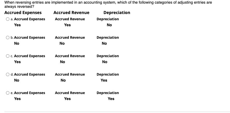 When reversing entries are implemented in an accounting system, which of the following categories of adjusting entries are always reversed? Accrued Expenses a. Accrued Expenses Yes b. Accrued Expenses No c. Accrued Expenses Yes d. Accrued Expenses No e. Accrued Expenses Yes Accrued Revenue Accrued Revenue Yes Accrued Revenue No Accrued Revenue No Accrued Revenue No Accrued Revenue Yes Depreciation Depreciation No Depreciation No Depreciation No Depreciation Yes Depreciation Yes