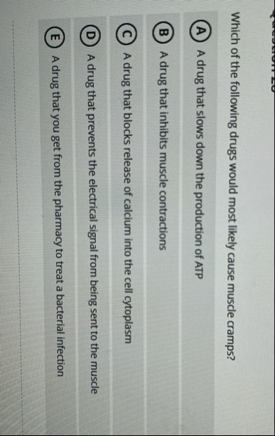 Which of the following drugs would most likely cause muscle cramps? A drug that slows down the production of ATP A drug that inhibits muscle contractions A drug that blocks release of calcium into the cell cytoplasm A drug that prevents the electrical signal from being sent to the muscle A drug that you get from the pharmacy to treat a bacterial infection