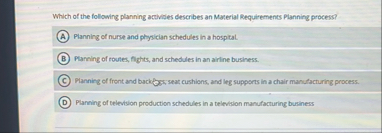 Which of the following planning activides describes an Material Requirements Planning process? Planning of nurse and physician schedules in a hospital. Planning of routles, fights, and schedules in an airline business. Planning of front and backfos-, seat cushions, and leg supports in a chair manufacturing process. Planing of television production schedules in a television manufacturing business