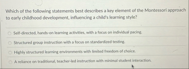 Which of the following statements best describes a key element of the Montessori approach to early childhood development, influencing a child's learning style? Self-directed, hands-on learning activities, with a focus on individual pacing. Structured group instruction with a focus on standardired testine. Highly structured learning environments with limited freedom of choice. A relimee on traditional teacher-led instruction with minimal student interaction.