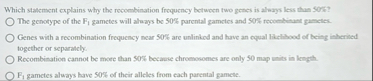Which statement explains why the recombination froquency between two genes is aleays less than Sors? The genotype of the