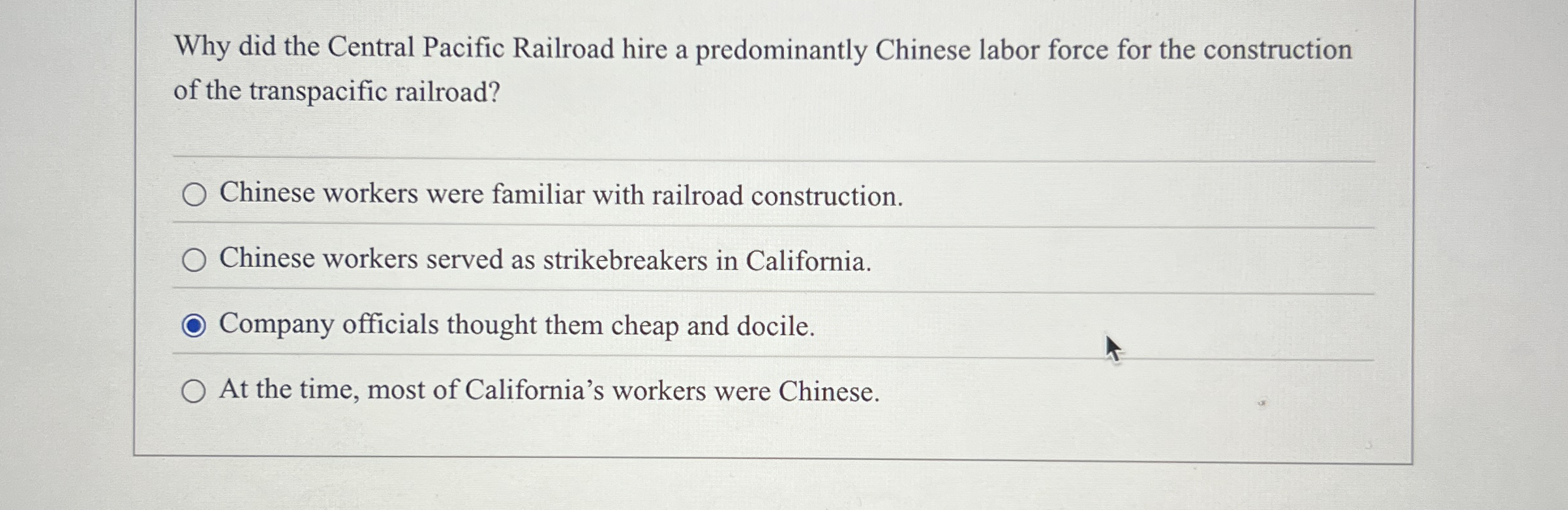 Why did the Central Pacific Railroad hire a predominantly Chinese labor force for the construction of the transpacific railroad? Chinese workers were familiar with railroad construction. Chinese workers served as strikebreakers in California. Company officials thought them cheap and docile. At the time, most of California's workers were Chinese.
