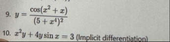 (Solved): y=(cos(x^(2) x))/((5 x^(4))^(2)) x^(2)y 4ysinx=3 (Implicit differentiation) ...