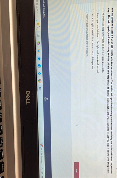 You are called to assess a 4 -year-old female who is unresponsive. The mother tells you that her daughter has been vomiting and had diarrhea for the past two days. The skin is pale, cool and clammy and the child is only responsive to painful stimuli. What other assessments would you expect to find with this patient? An increased respiratory rate and an increased pulse rate. A non-purposeful stare to the right and a sunken fontanel. Instant caplinary refill time on the hands of the patient. An increased auscultated blood pressure. ational Group, HC. maxe