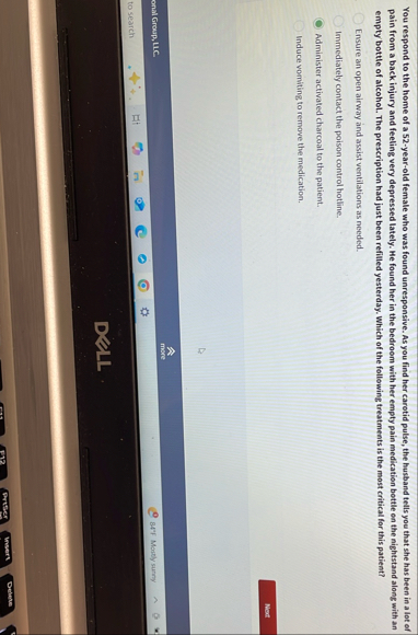 You respond to the home of a 52 -year-old female who was found unresponsive. As you find her carotid pulse, the husband tells you that she has been in a lot of pain from a back injury and feeling very depressed lately. He found her in the bedroom with her empty pain medication bottle on the nightstand along with an empty bottle of alcohol. The prescription had just been refilled yesterday. Which of the following treatments is the most critical for this patient?