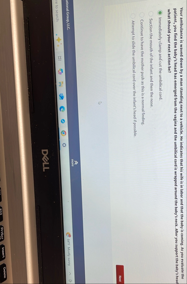Your ambulance is waved down by a man standing next to a vehicle. He indicates that his wife is in labor and that the baby is coming. As you evaluate the patient, you find the baby's head has emerged from the vagina and the umbilical cord is wrapped around the baby's neck. After you support the baby's head what should your next action be? Immediately clamp and cut the umbilical cord. Suction the mouth of the infant and then the nose. Continue to have the mother push as this is a normal finding. Attempt to slide the umbilical cord over the infant's head if possible. mane ational Groxp, LIC. 84'F Mostly sunny re to search